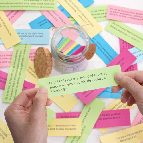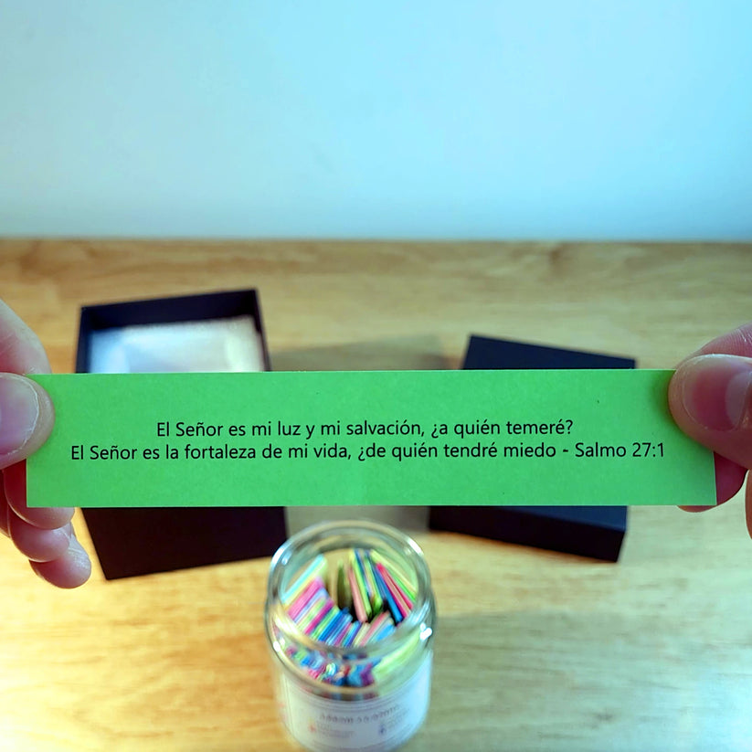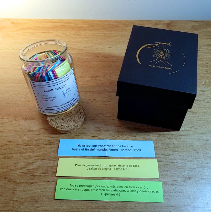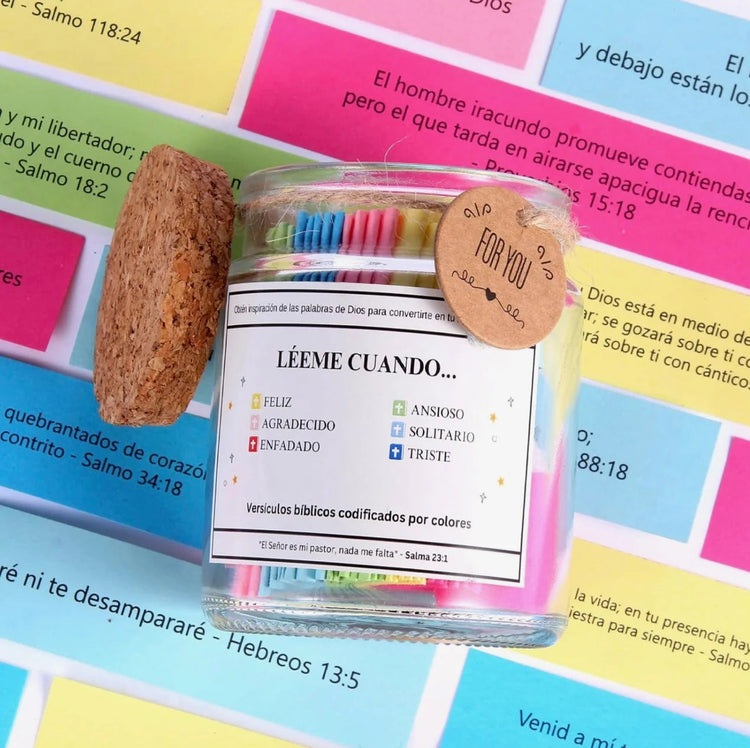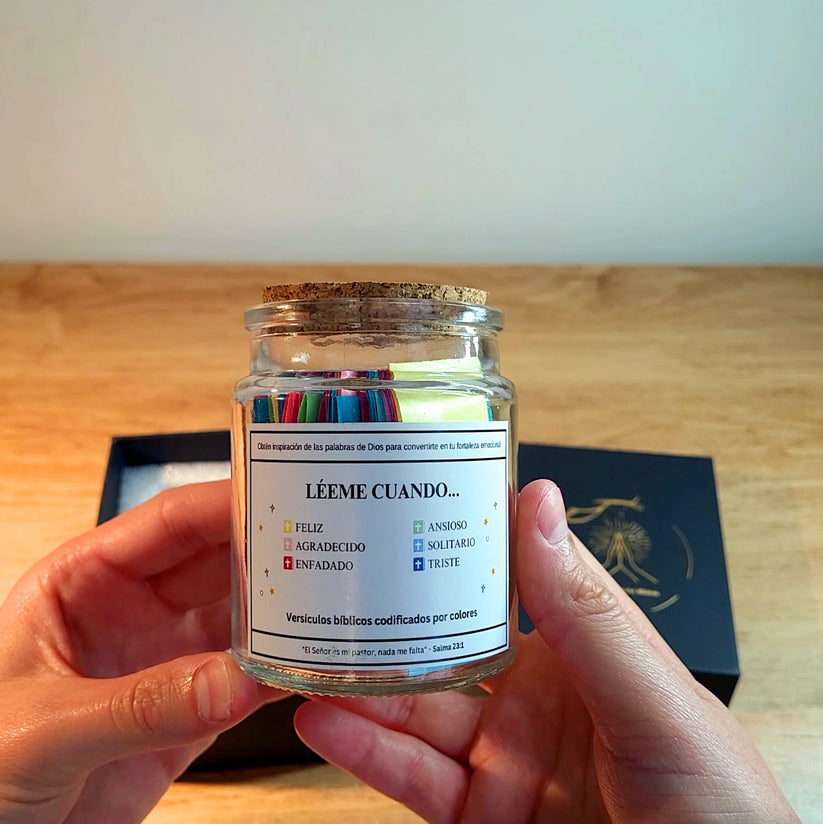 El frasco incluye 90 versículos bíblicos organizados por colores según emociones (alegría, tristeza, ansiedad, gratitud, soledad, enfado…). Cada mensaje está impreso individualmente y listo para abrir cuando lo necesites.
